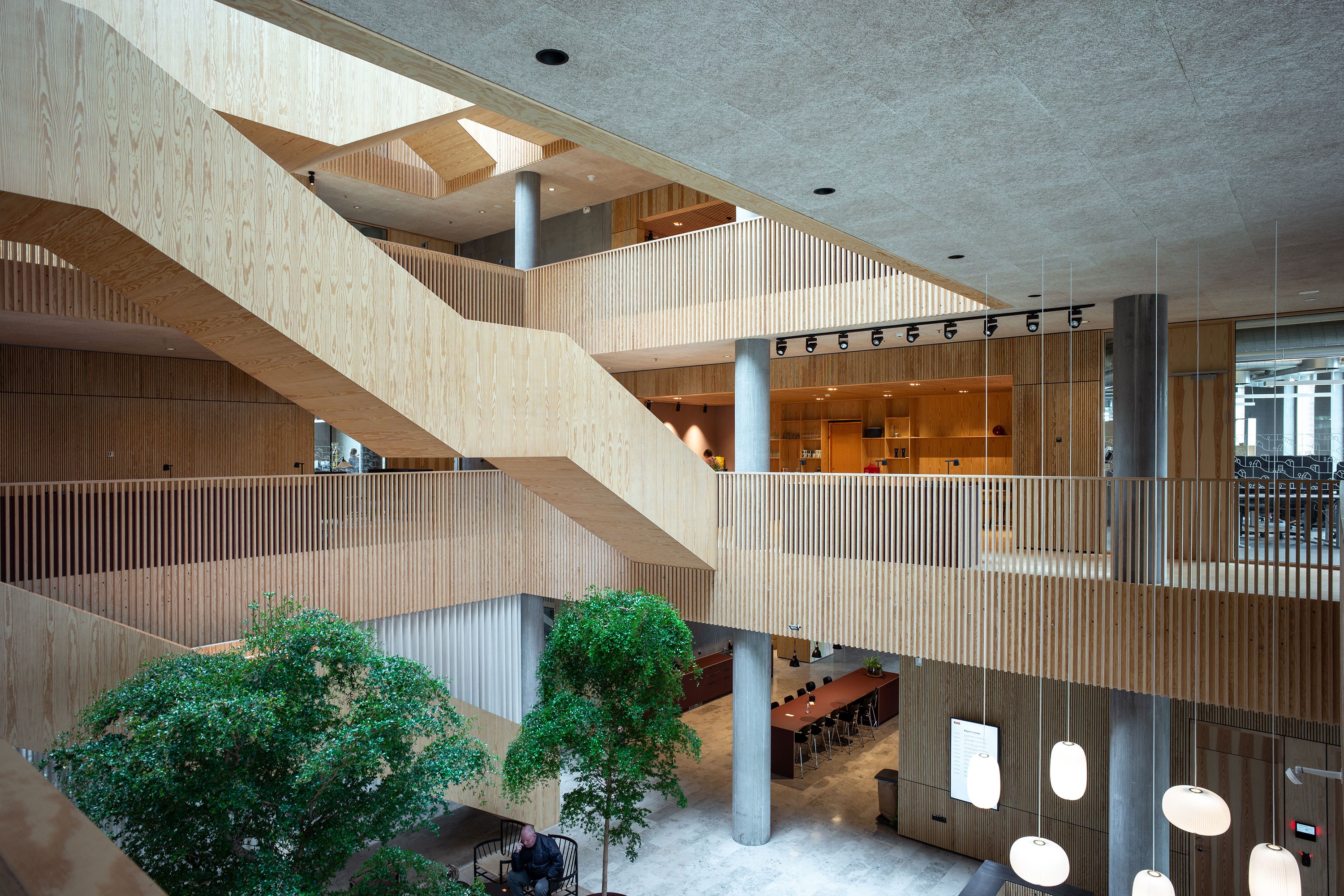 De keuze voor Troldtekt tiles T24 zorgt voor een ruimte met een goede akoestiek en een elegante uitstraling. Met een verlaagd en volledig demonteerbaar plafond, zijn de montage en installaties boven het akoestische plafond eenvoudig te controleren.